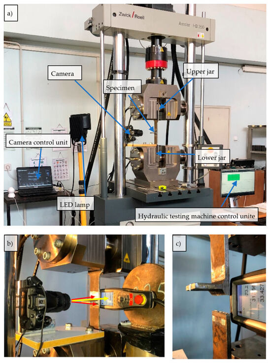 9] and effectively capture the expected crack initiation areas (weld toes). The camera was connected to an uninterruptible power source and a computer. Using DigiCamControl software (v2.1.0), images were captured in time-lapse at 10 s intervals (0.1 Hz). The computer offered the possibility to save each photo taken during the cyclic test. LEDs (light-emitting diodes) and halogen lamps were used as additional lighting to enable the camera’s high shutter speed. Shutter speed, aperture, and ISO sensitivity were adjusted for each test run. To capture both the topography of the weld crack and the number of cycles (N) within the same image, a cycle counter display was integrated into the setup.