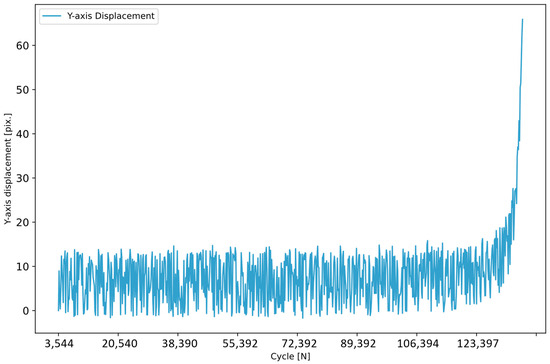 11], the assessment of crack initiation is determined using data from the hydraulic press. The datasets from the press itself are high-frequency (17 Hz) compared to the data obtained using the industrial photogrammetry approach (0.1 Hz). The data of the press correspond to the actual degree of deformation of the specimen in a given cycle (moment). Summarizing the fact that the data from the hydraulic press are high-frequency measurement data of the specimen, while the data from the photogrammetric measurement are of lower frequency due to the imperfection of the equipment and were obtained without contact, it can be concluded that the data from [