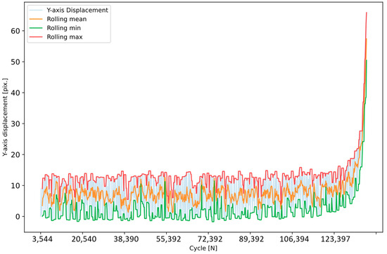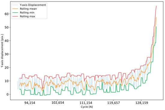 Figure 8 show a visualization of the moving average of the sample data defined based on a window of five data. From the graph, the tendency of material separation is clear, but due to the fluctuation of the value, it is difficult to filter out a specific moment that can be defined as the moment of the beginning or only the break of the test specimen. Also shown in the same figures is a visualization of the moving minimum mean of the data defined based on a window of five data. The graph clearly shows the tendency of material separation, much more clearly than with the moving average method. An increase in the minimum value may indicate an increase in the stretching of the material and that it no longer returns to its initial state, which is the result of material fatigue. However, due to oscillations in the value, as with the previous method, it is not possible to precisely model a specific moment that can be defined as the moment of the beginning or just the crack of the test specimen. In addition to the mentioned methods,