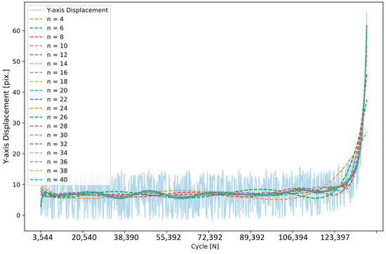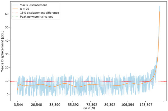 11], the moment at which the value of the polynomial exceeds the maximum from the middle of the data for a certain percentage is sought, and this cycle is considered to be the detection of the crack of the test specimen, i.e., the critical value at which the crack begins. To ensure that the method is scientifically sound, tests and research were carried out on the optimum order of the polynomial and the percentage deviation of the critical value. The tests were carried out with polynomials of even order numbers from 4 to 40, and the values 3%, 5%, 7%, 10%, 13%, 15%, and 20% were taken as percentages [