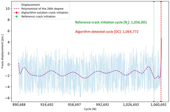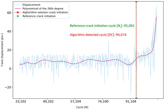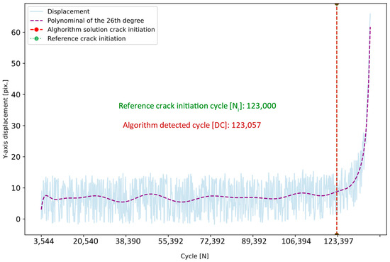 Table 1, the 26th-degree polynomial deviates on average by 0.66% from the reference crack initiation cycle. Summarizing the data, it is concluded that the approximation by a 26th-degree polynomial with a deviation of the critical value of 5% provides the best results, which is why these parameters are used as a reference for the assessment of crack initiation.