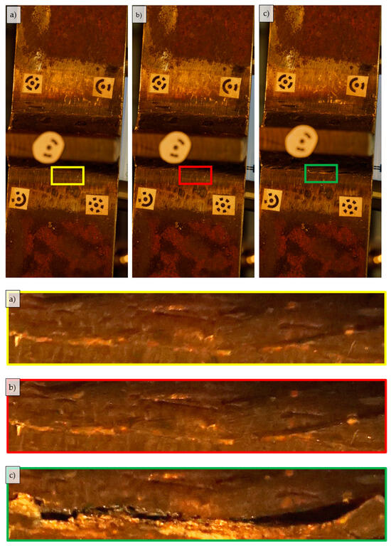 Figure 16 shows the result of the algorithm together with the visual confirmations of the crack detection. The purpose of the algorithm is to assess crack initialization before it is visible to the human eye. By comparing the reference image and the image that was detected at the moment of crack initialization, minimal changes are observed, but extremely detailed inspection and editing of the image are required to potentially see the crack [