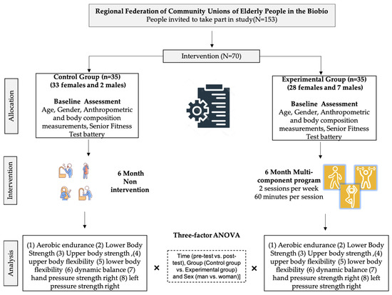 The selection of the study sample was non-probabilistic, for convenience, of an intentional nature, which allows subjects to be selected with a reduced sample and who agree to be included according to their accessibility and circumstances [37]. When accessing a sample of volunteer subjects, the assignment was made to ensure that they had similar characteristics in variables such as age, BMI, and physical independence, so the results or effects were a product of the intervention program and not of individual differences [38]. A total of 153 people with overweight or obesity, adults 60 years of age or older—59 men and 94 women—were invited to take part in this study. The participants were members of the clubs of the Regional Federation of Community Unions for the Elderly in Concepción, in Chile’s Biobío region. Being 60 years of age or older, being overweight or obese, not having a medical condition that would prohibit participation in the tests or intervention program, being physically independent, signing an informed consent form, and participating in the entire process (i.e., initial data collection, exercise program (80%), final data collection) were the inclusion criteria.
