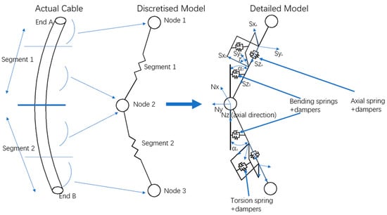 This paper utilizes the lumped mass method as a theoretical framework to describe the hydrodynamic properties of the tow cable, as depicted in Figure 1. In this method, the towed cable is discretized as a series of elastic, frictionless light springs, modeling only the axial and torsional properties of the cable. The inter-spring segments can be conceptualized as comprising two coaxial telescopic rods that are linked by axial and torsional spring dampers. The bending properties of the cable are depicted by rotational spring dampers positioned at both ends of the cable segment, connecting the segment to the node. The cable does not have to be axisymmetric since different values of bending stiffness can be specified for the two orthogonal bending planes. The nodes of the system concentrate the mass of the towed cable, fluid drag, added mass, gravity, and buoyancy. The nodes of each half-segment are combined and allocated to the nodes at the end of the segment, while the kinematic relationship between the nodes is utilized as a condition for continuity. Newton’s second law states that the equations governing the motion of the cable being towed can be determined and solved using numerical methods in an inertial coordinate system. This detailed view consists of three nodes and two line segments. The towed cable model structure is composed of three types of spring dampers. The first type is the axial spring damper, which is employed to simulate the axial stiffness and damping in the cable. It applies equal and opposite effective tension to the nodes at the ends of the line segment. The second type is the bending spring damper, which is employed to simulate the bending properties of the cable. The third type is a torsion spring damper, which is employed to simulate the torsional stiffness and damping of the cable. It exerts equal and opposite torque moments on the nodes located at both ends of the segment.