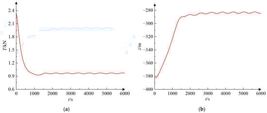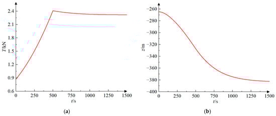 The course of the motion response of a towed system in accelerated motion. (a) The trend of tension in the towed cable over time; (b) The trend of the depth of the towed body over time.