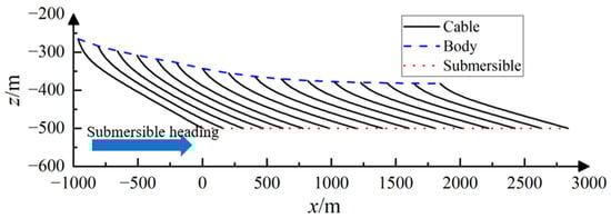 The course of the towed body depth and towed cable tension during the accelerated and circular rotational motions are shown in Figure 3 and Figure 4. In this paper, towed cable tension refers to the tension at the point where the towed cable connects to the submersible. This is the point where the forces on the entire towed system are most concentrated, and understanding and monitoring the tension at this point is critical to ensuring the stability and safety of the system. During accelerated motion, the towed body’s depth stabilizes gradually from one initial depth to another. The inertial effect of the towed body significantly impacts the system’s maneuverability. Once the submersible reaches a constant speed, the tension in the cable stabilizes at a specific level. When the submersible undergoes circular rotational motion, the change in the depth of the towed body and tension in the towed cable can be divided into two phases: an initial phase of a continuously changing transient state, followed by a stable long-term variation. Figure 5 displays the changes in the shape of the towed cable when the submersible undergoes accelerated motion. The cable pattern was recorded at intervals of 100 s, starting from 0 s and continuing throughout the entire 1500 s acceleration duration. The alteration in the shape of the towed cable during the circular rotation was documented at intervals of 25 s, starting from 3000 s and continuing until 3500 s, as depicted in Figure 6.