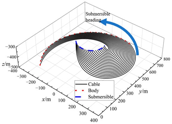 The equations of motion control for the underwater towed system of a submersible with varying cable length can be obtained by coupling Equations (3), (5) and (10), which can be solved by using the Runge–Kutta method under the given initial value conditions.