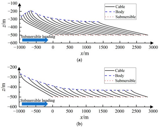 To investigate the impact of various towed cable speeds on motion response during accelerated motion, the towed cable’s initial length is 1000 m, the submersible operates 500 m below the horizontal plane, and the cable speeds are 0.8, 0.9, 1.0, 1.1, and 1.2 m/s. The speed of the retraction and deployment cables is taken from the Zhang literature [], and this speed satisfies practical engineering applications. The lengths of submersibles under different speeds of towed cable have been adjusted to 500 m, with time and speed range changes matching those in Section 4.1. This study presents the course diagram of motion response during acceleration and the change diagram of motion response during variable speed change cable length. The plot in Figure 7 illustrates the change in shape of the towed cable during the retraction and deployment maneuver while undergoing acceleration. Figure 7a shows the variation of the towed cable shape at a retraction speed of 1.0 m/s. Figure 7b shows the variation of the towed cable shape at the deployment speed of 1.0 m/s.