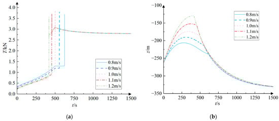 The motion response history of the towed system for different cable retraction speeds during the accelerated motion of the submersible. (a) The trend of tension in the towed cable over time; (b) The trend of the depth of the towed body over time.