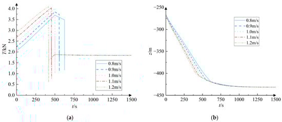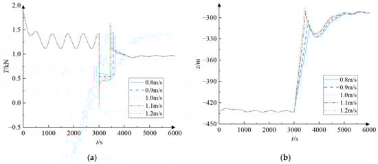 The motion response history of the towed system for different cable deployment speeds during the accelerated motion of the submersible. (a) The trend of tension in the towed cable over time; (b) The trend of the depth of the towed body over time.