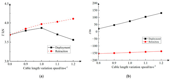 The motion response values of the towed system when the rate of change of the length of the towed cable varies during the accelerated motion of the submersible. (a) The maximum tension of the towed cable; (b) The difference in depth variation of the towed body.