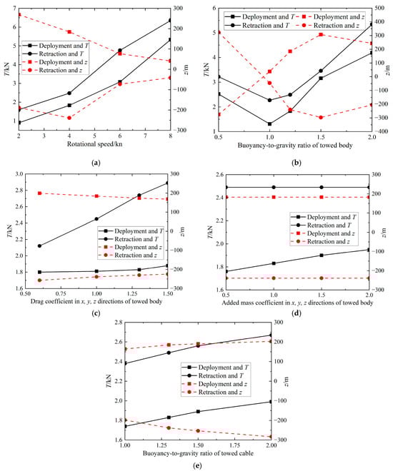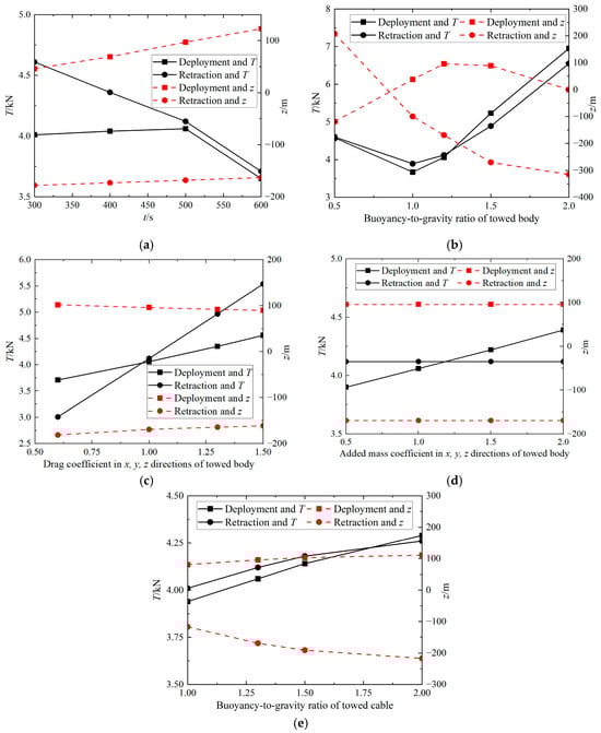 Figure 16a illustrates that the submersible rotational speed is 8 kN. The maximum tension values during recovery and deployment are the largest, and the drag body depth variation values are closer to 0, which are 6.35 kN, 5.33 kN, −41 m, and 41 m. The increase in maximum tension with increasing speed is well understood. The reason that the value of the depth variation of the towed body decreases at higher rotational speeds is that at high towed speeds, the lift and drag effects of the fluid surrounding the towed body and the inertial forces of the system are enhanced. These forces will balance the motion of the towed body to some extent and stabilize it in a certain depth range, thereby reducing the cyclic variation in depth. In Figure 16b, it can be observed that when the buoyancy-to-gravity ratio of the towed body is 1.0, the maximum tension values of the towed cable are at their minimum for both the retracting and deploying cables. Additionally, the depth change of the towed body is closer to 0 m, with values of −46 m and 38 m. The corresponding tension values for these depths are 2.27 kN and 1.31 kN, respectively. In Figure 16c, it is evident that the maximum tension during deployment remains relatively constant despite variations in the towed body resistance coefficient. As depicted in Figure 16d, the added mass coefficient of the towed body solely impacts the maximum tension during the deployment maneuver. A smaller added mass coefficient results in a correspondingly smaller maximum tension. When the added mass coefficient is 0.5, the maximum tension is 1.76 kN. From Figure 16e, when the buoyancy force per unit length of the towed cable is equal to gravity, the maximum tension of the towed cable is the smallest, and the value of the depth change is closer to 0 m.
