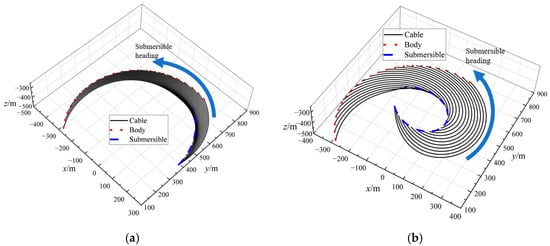 The circular rotational radius and rotational speed are determined by Section 4.1, while the initial cable length, retraction and deployment speed, submersible depth, and cable length variation range are in accordance with Section 4.2.1. When the submersible is performing circular rotational motion, the motion response of the towed system is divided into two phases: transient and long-periodic steady states. When the submersible is performing circular rotational motion, the motion response of the towed system is divided into two phases: transient and long-periodic steady states. This study aims to analyze the motion response of the towed system during the steady-state period under the towed cable maneuver. The towed cable maneuver is carried out only after the towed system enters steady-state operation, so the towed cable maneuver is chosen to be carried out 3000 s after the start of the simulation. As shown in Figure 12, the variation of towed cable shape during the retraction and deployment maneuver during the rotational motion is plotted. Figure 12a shows the variation of the towed cable shape at a retraction speed of 1.0 m/s. Figure 12a shows the variation of the towed cable shape at the deployment speed of 1.0 m/s.