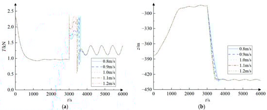 The motion response history of the towed system for different cable deployment speeds during the circular rotational motion of the submersible. (a) The trend of tension in the towed cable over time; (b) The trend of the depth of the towed body over time.