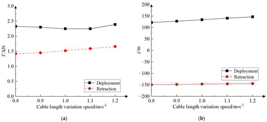 Figure 15 displays the variations in motion response induced by the submersible while executing circular rotating motion and cable retraction and deploying processes. Figure 15a shows the maximum tension of the towed cable during circular rotational motion at different retraction and deployment maneuvering speeds. The maximum tension values for both retraction and deployment were 1.66 kN and 2.39 kN at a rate of variation of 1.2 m/s in cable length. While the maximum tension is reached when the rate of change of cable length is at its peak, the rise in maximum tension does not directly correspond to the increase in the rate of change of cable length. This is due to the fact that the variation of the towed cable tension during the submersible circular rotational motion shows an obvious long periodicity and the time of the maximum tension appearing at different rates of cable length change is not consistent. The maximum tension can be greatly diminished if the alteration in cable length concludes at the minimum point of the tension fluctuation cycle. Figure 15b shows the change in towed cable depth at the completion of a maneuver when retracting and deploying are carried out during the steady condition of circular rotating motion. A higher rate of cable length change during retraction results in a lesser depth change. At a cable retraction speed of 0.8 m/s, the depth change of the towed body is −148 m. A higher rate of change in cable length during deployment results in a larger difference in depth. When the cable is deployed at a speed of 1.2 m/s, the depth of the towed body varies by 147 m.