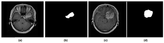 Figure 2. Multiple MRI brain images depicting tumors with corresponding masks from a 2D brain tumor segmentation dataset [44]. (a) Original MRI image showing a tumor. (b) Binary mask highlighting the tumor region. (c) Additional MRI scan. (d) Corresponding binary mask indicating the tumor.