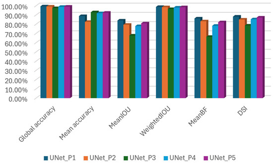 The previous table clearly shows the effectiveness of reducing the kernel size, which is the field of view of the filter and adjusting the number of depth channels and the dropout ratio during training time. The shortest training time was achieved by U-Net_P3, completing training within 21 min. The performance criteria for each model were computed, and the results are summarized in Table 4.