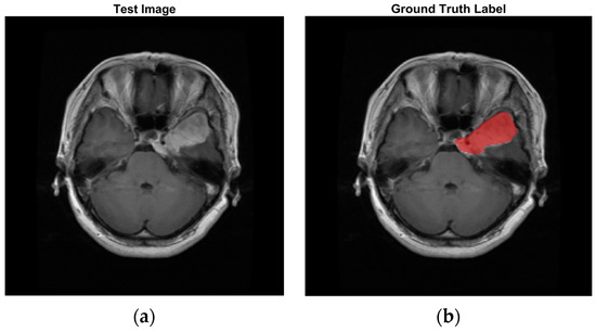 The dataset used in this study is a 2D brain tumor segmentation dataset. It is publicly available on Kaggle at the following link: https://www.kaggle.com/datasets/nikhilroxtomar/brain-tumor-segmentation/data (accessed on 20 September 2023) [44]. This dataset comprises 3064 pairs of T1-weighted contrast-enhanced images and their respective binary masks indicating tumor presence. The photos are in .png format; each image is sized 512 × 512 pixels. The dataset consists of imaging data from 233 patients, encompassing various types of brain tumors. The distribution of tumor types within the dataset is as follows: Meningioma—708 slices; Glioma—1426 slices; Pituitary tumor—930 slices. These data provide a diverse representation of brain tumor types commonly encountered in clinical practice, facilitating comprehensive research and development of segmentation algorithms and diagnostic tools [38]. Figure 2 shows an example of a brain MR image alongside its corresponding tumor segments.