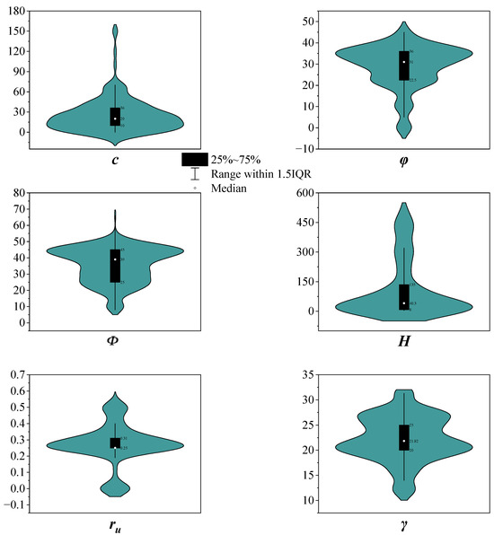 Geological materials such as soil, rock, and sand are exposed to a complex environment of strain rates, water, and temperature changes over a long period time, and their complex pore structures result in extremely discrete mechanical properties [57,58,59,60,61]. Due to the limitations of open available geological data, it is not possible to comprehensively consider all potential variables. This section compiles a dataset encompassing 307 sets of data based on available measurements reported in the literature [62,63,64,65,66,67] for training and developing ML models to predict FoS. Referring to the practice of ref. [68], the six most representative variables were selected to evaluate FoS. These six key variables include friction angle (φ), cohesion (c), unit weight (γ), slope height (H), slope angle (Φ), and pore pressure ratio (ru). Here, φ, c, and γ reflect the mechanical properties of the rock and soil mass, ru reflects the magnitude of the pore water pressure, and H and Φ reflect the geometric characteristics of the slope.