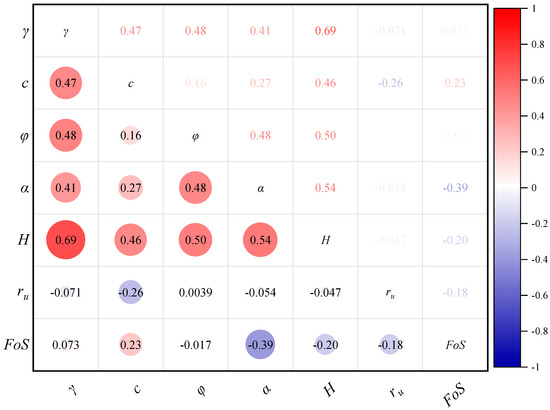 To study the correlation between different input variables, Figure 3 analyzes the correlation between the six key input variables of the dataset and the output results FoS. It can be seen that the correlation coefficient of two identical variables is represented diagonally from bottom left to top right as the symbol of the variable (representing a correlation coefficient of 1). The correlation coefficient of the part above the diagonal is the same as that of the other part of the symmetry. The correlation coefficients between the different input variables and FoS are relatively low (most values are less than 0.4). That is to say, it is not easy to find an obvious relationship between the six input variables and FoS, which indicates that there is a strong nonlinear relationship between FoS and input variables.