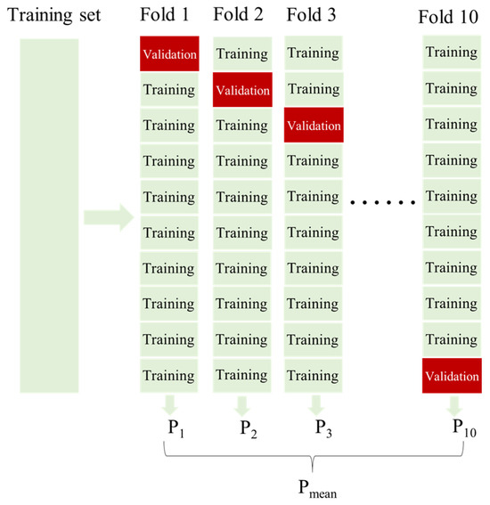 In order to minimize the bias introduced by randomly splitting the training and test sets in Section 3.1, the K-fold cross-validation (K-CV) method is utilized. K-CV is a statistical method of splitting a dataset into smaller subsets and effectively eliminating the bias caused by sampling randomness. The original training set is equally divided into K different subsets, each subset is utilized as a new test set, and the remaining K − 1 subsets are utilized as new training sets. The accuracy of the ML model on each subset is evaluated to evaluate the effectiveness of the proposed method. As suggested by Kuhn and Johnson [70], 10-fold or 5-fold cross-validation is recommended. In this study, 10-fold cross-validation is used according to the scale of the dataset and the computational time. The process of 10-fold CV is shown in Figure 4, where P1, P2, …, and P10 represent the prediction results of the corresponding folds, respectively.