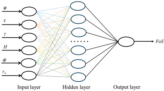 The ANN model framework constructed in this section is shown in Figure 5. The model consists of neurons connected to construct a multi-layer neuronal network. Input variables such as friction angle (φ), cohesion (c), and unit weight (γ) are transmitted and trained through neuronal connections and activation functions. The optimal number of neurons in the Hidden layer is constantly adjusted during training to minimize the error between the predicted FoS value and the true FoS value. Training means that the ANN model needs to learn the weights associated with all neurons. As shown in Equation (8), the weighted sum of all inputs is passed through the nonlinear activation function f.