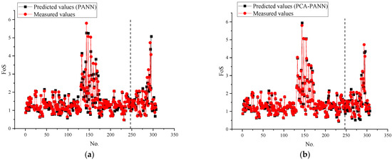 Comparisons between the measured and predicted values. (a) PANN model; (b) PCA-PANN model.