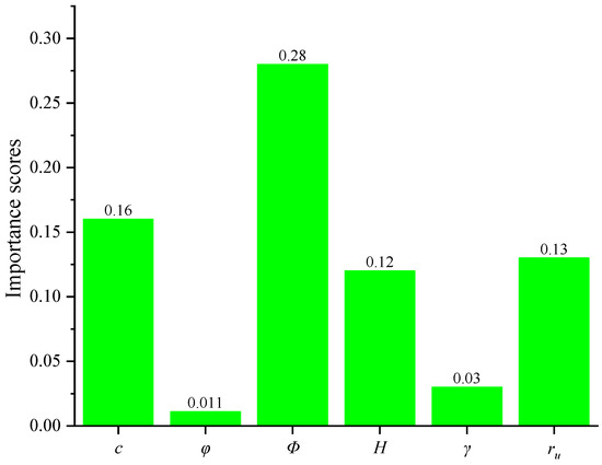 For the problem of slope stability evaluation, feature importance analysis can reflect the relevant influence degree of each influencing factor on slope stability, so as to provide an effective reference for the formulation of slope safety protection. Figure 10 shows the results of the sensitivity analysis. The results show that slope angle (Φ) is 0.28, cohesion (c) is 0.16, pore pressure ratio (ru) is 0.13, slope height (H) is 0.12, unit weight (γ) is 0.03, and friction angle (φ) is 0.011. It is important to note that the importance scores and ranking of each input variable will be different for different datasets and different feature importance scores. It is worth mentioning that the importance ranks of each of the input variables obtained in this paper apply only to the dataset in Section 3 and cannot be considered as general rules. With more valid slope cases and more comprehensive feature consideration in the future, more representative results can be obtained.