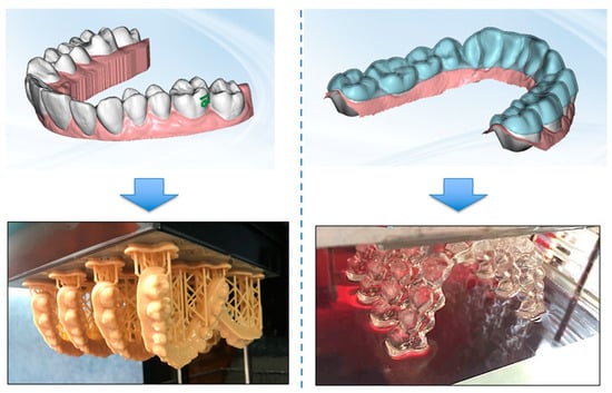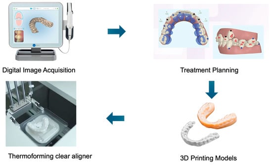 - Tartaglia, G.M.; Mapelli, A.; Maspero, C.; Santaniello, T.; Serafin, M.; Farronato, M.; Caprioglio, A. Direct 3D Printing of Clear Orthodontic Aligners: Current State and Future Possibilities. Materials 2021, 14, 1799. [Google Scholar] [CrossRef] [PubMed]