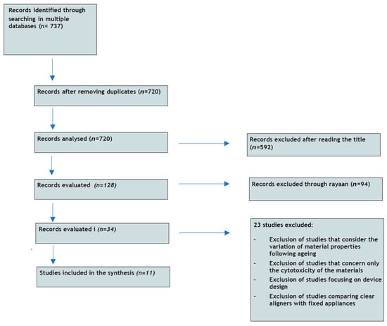 The application of specific criteria led to the selection of 34 eligible studies, for which the full text was obtained and assessed. Finally, 23 articles were excluded because they did not match the previously established selection criteria, and 11 relevant articles were included. These studies evaluated 17 different clear aligner materials and their properties by comparing the different materials analyzed: