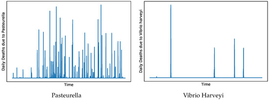 The infectious diseases examined herein are those for which there were a sufficient amount of data available to effectively train the developed ML models; those diseases are the diseases caused by the bacteria Pasteurella, Vibrio Harveyi and Myxobacteria, as well as Viral Nervous Necrosis (VNN). We note that Viral Nervous Necrosis was not studied in our previous work [11], due to the lack of data at the time the research was conducted. Moreover, the data for Pasteurella, Vibrio Harveyi and Myxobacteria used herein have been augmented relative to [11].