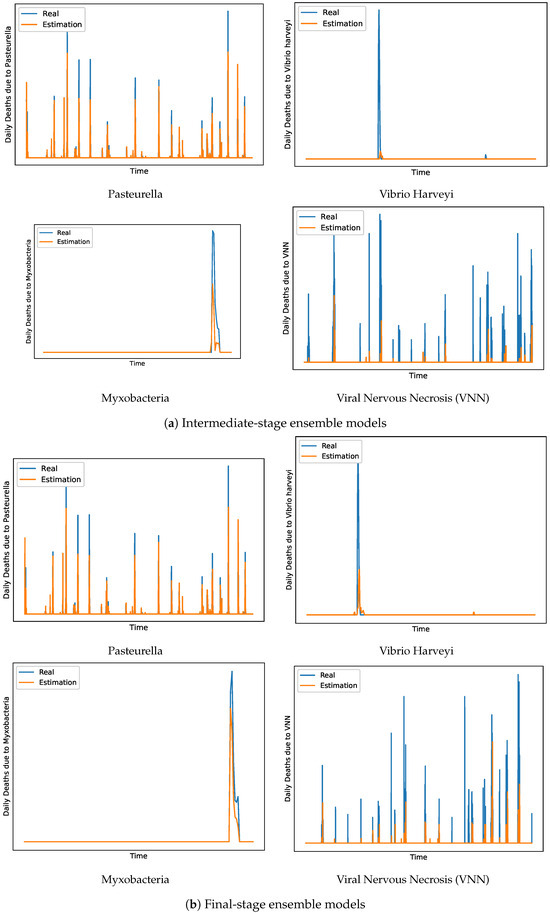 Thereafter, for each one of the examined diseases, Figure 4 depicts the estimation of the intermediate and final stage ensemble models in the validation dataset for the number of fish deaths on the 3rd forthcoming day. Firstly, it is evident that the estimations of the intermediate and final stage ensemble models for Pasteurella and VNN display no significant visual differences; in contrast, the intermediate and final stage ensemble models for Vibrio Harveyi and Myxobacteria demonstrate noticeable visual variations. In general, the ensemble models for Pasteurella, Myxobacteria, and VNN demonstrate a close alignment between real and estimated data points, indicating a high degree of model accuracy. Particularly noteworthy are the models for Myxobacteria, which nearly perfectly capture the actual spike, suggesting exceptional predictive precision. However, the models for Vibrio Harveyi show a significant discrepancy during peak events, where the models underestimate the severity of the impact.