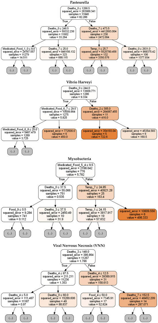 Thereafter, the Decision Trees of the DT models encompassed into the trained final stage ensemble models are concisely presented in Figure 5. Note that, for an efficient presentation, only the root node and the next two levels of each Decision Tree are shown. The depicted Decision Trees exemplify the capability of the ensemble models to tailor their predictive mechanisms to the peculiarities of each pathogen, namely, Pasteurella, Vibrio Harveyi, Myxobacteria, and VNN. The Decision Trees shownin Figure 5 not only furnish a transparent decision-making process but also reveal critical biological and environmental thresholds that significantly influence mortality outcomes. For instance, factors like water temperature and administered amounts of food and medicated food, which are prominently featured in the Decision Tree concerning Pasteurella, are identified as pivotal in the disease’s propagation. Such insights are indispensable for aquaculture operators, as they highlight specific conditions under which preventive measures could be most effectively deployed.