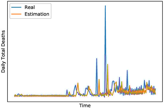 We close this section with the presentation of the results concerning the total number of fish deaths (due to all causes), during the examined time period. Accordingly, Figure 6 depicts the estimation of the developed final stage ensemble model in the validation dataset, for the total number of fish deaths on the next day. For that case, the MAE of the final stage ensemble model is 1850, which is thus lower than the MAE of the standalone ANN and SR models developed in [11], which was 1900 and 2070, respectively. This represents an improvement of approximately over the ANN, and a more substantial reduction compared to the SR model. The intermediate stage ensemble model achieved an MAE of 1880, indicating a improvement over the ANN and a reduction compared to the SR model of [11]. While both ensemble stages demonstrate significant enhancements over the standalone models of [11], the final stage ensemble model achieves slightly better results than the intermediate-stage model, reflecting a consistent trend of incremental improvement in the final stage.