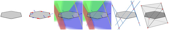 Example of the stages of a single-direction polygon–polyhedron evolution. From left to right: initial evolution step from f to , evolution parameters (blue arrows represent the edge tilted normal vectors, red arrows represent the edge direction vectors), evolved point , and the resultant polyhedron as the union of the vertices from f, , and (yellow arrow indicates the evolution direction).