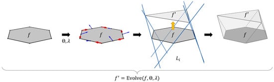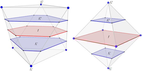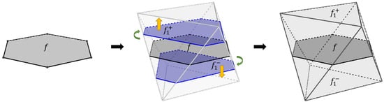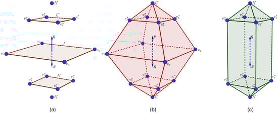 The following paragraphs describe the double-direction polygon–polyhedron evolution process in formal terms. Let f be a seed polygon with a normalized normal vector, . An additional sequence of evolution steps, along with , allows for the generation of polyhedra that a single-direction polygon–polyhedron evolution cannot describe. A positive evolution step occurs above f along , and a negative evolution step occurs below f along .