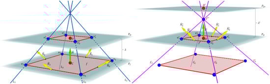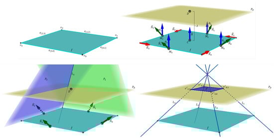 An evolution step requires two types of parameters: tilting angles associated with the edges of the polygon and a scalar value determining the maximum length allowed for the step. Let be a set of tilting angles, and let be a scalar value. A tilting angle, , rotates using as the rotation axis vector; the rotated vector is the normal vector of a plane that contains e. Then, , where is the axis–angle rotation (also known as Rodrigues’s rotation formula). The plane passes through e. The intersection between the planes from the two edges incident to a vertex, , defines a line, ; therefore, . Finally, a point, , and planes and . The top right subfigure in Figure 4 shows an example of the mentioned elements on a square polygon.
