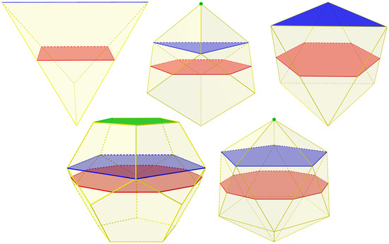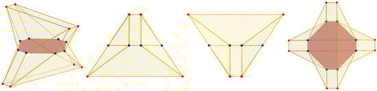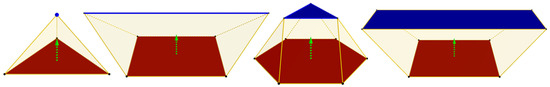 The following paragraphs describe the single-direction polygon–polyhedron evolution process in formal terms. We consider using evolved n-polytopes as the seed polygons for subsequent evolution steps. An evolved n-polytope Evolve where with becomes the seed polygon for another evolution step. Such a new step requires its own set of evolution parameters, with (i.e., the number of tilting angles for the new evolution step is equal to the number of sides of ). A new evolved n-polytope Evolve is, then, an additional step in the evolution sequence from the original seed polygon, , into a n-polytope, . Considering the set of vertices from polygons and n-polytope , this set contains the vertices of a polyhedron described by the two-step evolution of f into . Figure 7 shows an example of the elements for the evolution of a polygon into a single point through two evolution steps.