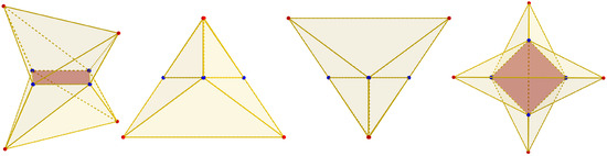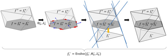 We expand the family of evolved polyhedra by considering negative evolution steps. A negative evolution step is the opposite of the normal vector from the respective seed polygon. We must flip the orientation of the seed polygon for the first negative evolution. In that way, we can consider negative evolution steps as regular evolution steps, as discussed so far. Figure 8 shows an example of the stages during a double-direction polygon–polyhedron evolution process. The polygon f is the seed polygon for two evolution sequences: a positive (along the normal vector of f) step and a negative step (opposite to the normal vector of f). We refer to f as for the positive step, and for the negative step. A new evolved polytope Evolve corresponds to the negative evolution step. In such an example, the union of the vertices from polygons f, and represents a new polyhedron.
