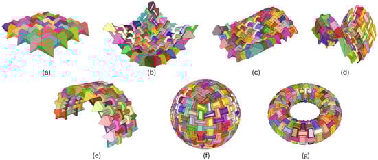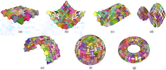 TICs built using truncated tetrahedra based on different geometric domains: (a) planar, (b) elliptic paraboloid, (c) wave, (d) saddle, (e) barrel vault, (f) sphere, and (g) torus.