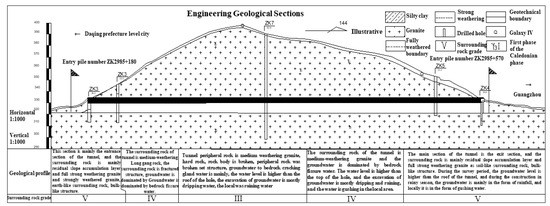 This project is conducted on the Jiangxi Xiaoyuan Tunnel, which spans a total length of 390 m. It is the first super-large transverse cross-section highway tunnel in the province and marks the initiation of four-lane tunnels in Jiangxi Province. Located in Xiaoyuan Village, Daping Township, Nankang District, Ganzhou City, the Xiaoyuan Tunnel is an essential part of the Ji’an to Nankang expansion project within the Jiangxi section of the Daguang Expressway. The tunnel starts at Jianxia Village in Zhongshi Township, Suichuan County, Ji’an City, and extends southward along the existing Daguang Expressway. The project scope includes the reconstruction of the Tang Village Interchange, crossing the G105 national highway, passing through Nihu and Qiaotou, and eventually redeveloping the original site of Daping Village to modify the Hengshi Service Area ramps. The route passes through Tianxi, Qiaozhuang, and Fenwenlou, finally connecting with the C4 section at Gaobei Village, Hengshi Town. The surrounding rocks in the area where the tunnel is located are mainly fine-grained biotite granite, and the rock mass is broken with densely developed joints and fractures. The surrounding rock grades of the tunnel body are mainly Class III and Class IV, while some parts of the structural development zone are Class V surrounding rocks. The rock mass of the tunnel body is primarily composed of fine-grained biotite granite from the first stage of the Caledonian period, with generally to moderately developed fractures. The rock mass is relatively intact, and its tunnel-forming properties are generally good, making the surrounding rock of the tunnel wall relatively stable. However, during construction, due to the impact of artificial excavation sections, new fractures and other unfavorable factors may occur in the tunnel. Additionally, this area belongs to a hilly landform type, with ridges mostly trending northeast. The engineering geological longitudinal section of the tunnel is illustrated in Figure 1.