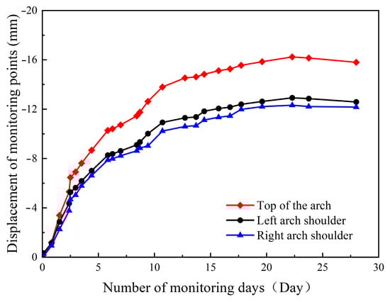 The monitoring results for the top of the arch, along with the left and right arch shoulders, are presented in Figure 4. The data clearly demonstrate consistent settlement trends across these points. Initially, the settlement values increase rapidly but gradually slow down and eventually stabilize. Notably, the monitoring data exhibit significant variability during the initial 15 days, with settlement values beginning to stabilize from the 16th day onward. This stabilization corresponds with the excavation of the tunnel’s left guide hole on the 16th day, which exposed the tunnel’s critical surface and induced the most substantial deformation of the surrounding rock. Following the implementation of initial support measures, vault settlement reached total deformation. By the 15th day, the excavation of the right guide hole was essentially complete, and the vault displacement largely stabilized. Subsequently, the tunnel then underwent a second lining construction, which resulted in a marked decrease in displacements at all monitoring points. The maximum settlement at the top of the arch vault was recorded at 15.8 mm and eventually stabilized. The settlement at the left arch shoulder consistently exceeded that at the right, with the maximum settlement reaching 12.4 mm. Additionally, displacement monitoring was conducted at two waist monitoring points in tunnel section ZK2985+420, with the results depicted in Figure 5.