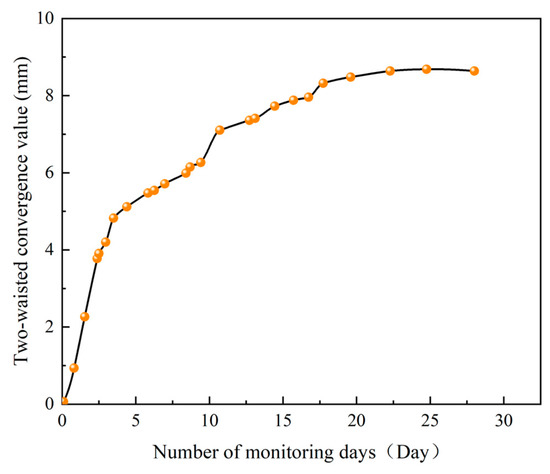 As depicted in Figure 5, the convergence change curve of the two waists exhibits a pronounced steep trend in the initial 15 days, attributed to the appearance of the critical section during the early stages of tunnel construction. As excavation progressed to the 20th day, with the near completion of the right guide hole, the convergence values at the two waist points began to stabilize. At this stage, the maximum convergence value recorded for both waist points was 8.6 mm. Hence, the convergence curve of the two waists can be comprehensively divided into three distinct stages: an initial rapid growth phase, subsequently transitioning to a deceleration phase, and finally stabilizing at a slower rate.