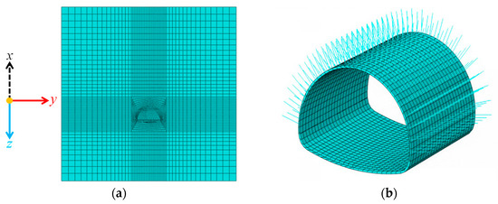 Three-dimensional numerical model. (a) Finite element numerical mesh diagram; (b) grid diagram of tunnel initial support.