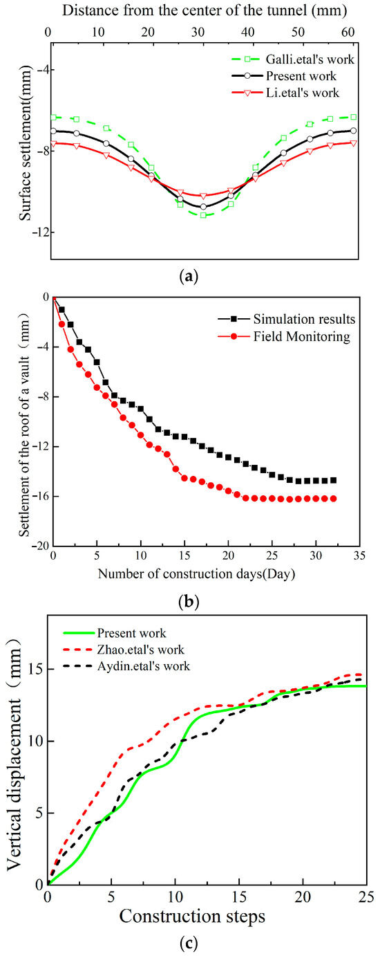 Diagram of model validation. (a) Comparison with two case studies on surface settlement; (b) comparison with field monitoring results; (c) comparison with two case studies on the vertical displacement of tunnel arch [3,27,28,29].