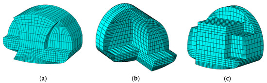 Drawing on the literature and construction experience, various concealed excavation methods for tunnels are available. We have selected three methods—the double-sided drift method, the CRD method, and the three-benching seven-step method—for comparative analysis. The construction sequence for these methods is detailed as follows: initially, the excavation and initial support of the left upper guide pit are undertaken, immediately followed by the excavation and initial support of the left lower guide pit. This sequence is succeeded by the sequential excavation and support of the right upper guide pit, the right lower guide pit, the center upper guide pit, and the center lower guide pit. The final stage involves the excavation of the superelevation arch, initial support, and casting and filling of the arch. The grid distribution of the 3D model for the double-sided drift method is illustrated in Figure 8a. The implementation process for the CRD method begins with the excavation and initial support of the upper guide pit on the left side, followed by the excavation and initial support of the lower guide pit on the though right side. Subsequent stages include the excavation and initial support of the left lower guide pit and the right upper guide pit. The process concludes with the excavation of the superelevation arch, its initial support, and the casting and filling of the arch. The grid distribution of the 3D model for the CRD method is displayed in Figure 8b. For the three-benching seven-step method, the procedure begins with the excavation and initial support of the upper ring of the upper guide pit. This is followed by the excavation and initial support of the left and right-side center guide pits, respectively. The method concludes with the excavation of the superelevation arch, its initial support, and the casting and filling of the arch. The grid distribution of the 3D model for this method is shown in Figure 8c.