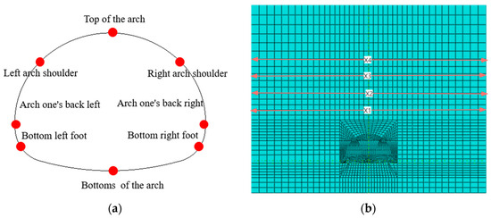 The key monitoring points and lines within the tunnel are organized as depicted in Figure 9. Four crucial lines, designated as X1, X2, X3, and X4, have been established at each of the tunnel vaults for intensive monitoring. These lines are positioned 10 m apart from each other.