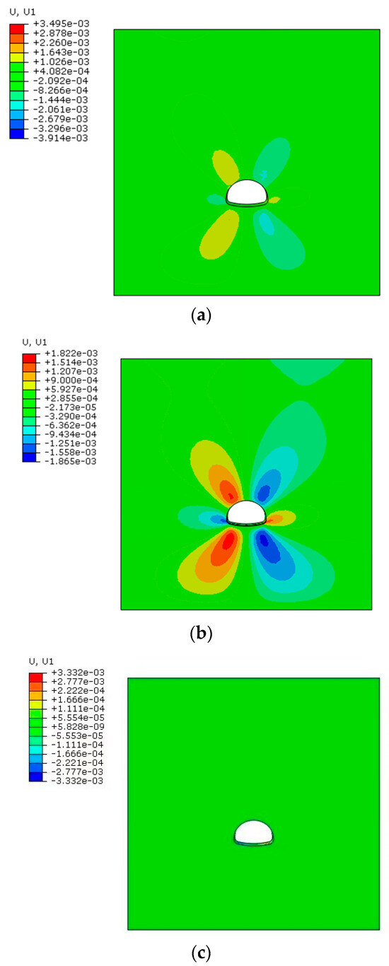 In this paper, the Mohr–Coulomb model is selected as the constitutive model during the numerical simulation. To prove the validity of the model, the numerical model of the present work was first compared with two case studies [27,28] on surface settlement, as shown in Figure 7a. The numerical results are basically consistent with the case studies. Then, the numerical result was compared with the field monitoring results as illustrated in Figure 7b. The construction of a support structure during numerical simulation is instantaneous while the construction of a support structure in practical engineering is relatively delayed. Therefore, the measured displacement is greater than the simulated displacement. To further prove the validity and efficiency of the model, we make another comparison with two case studies [3,29] on the vertical displacement of tunnel arch, as shown in Figure 7c. Although there is little difference among the curves, the trend of curves in Figure 7 is basically the same, which also proves the correctness of the numerical model.
