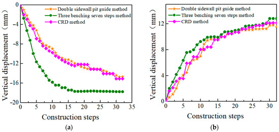 Variation in the tunnel arch/bottom displacements with the number of construction steps under the different working methods. (a) Vertical displacement of tunnel arch; (b) vertical displacement of tunnel bottom.