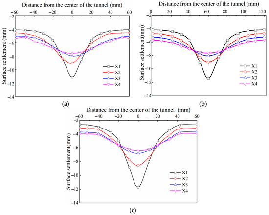 Surface settlement curves for the three working methods. (a) Double-sided drift method; (b) CRD method; (c) three-benching seven-step method.